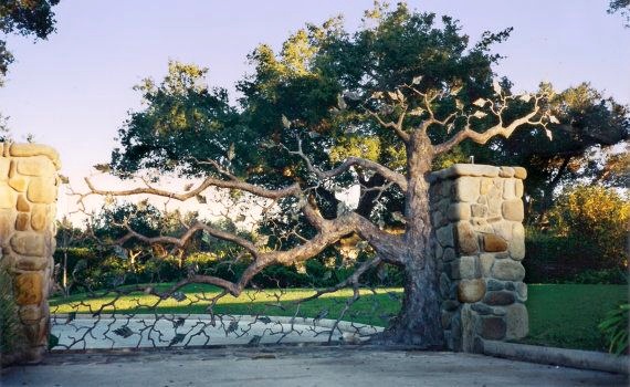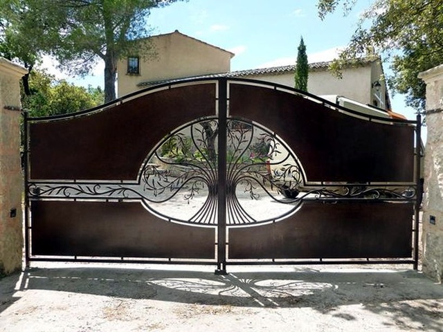 Кованые ворота и заборы, оформленные в романском стиле, часто используют прием художественного оформления в виде стилизованного дерева: в нижней части композиции размещают перевязанный хомутом "корень", от которого происходят симметричные завитки, обрамленные в верхней части кованого изделия компактным цветочным узором.